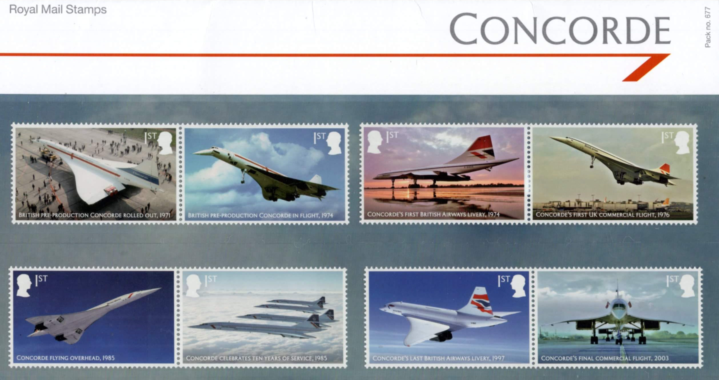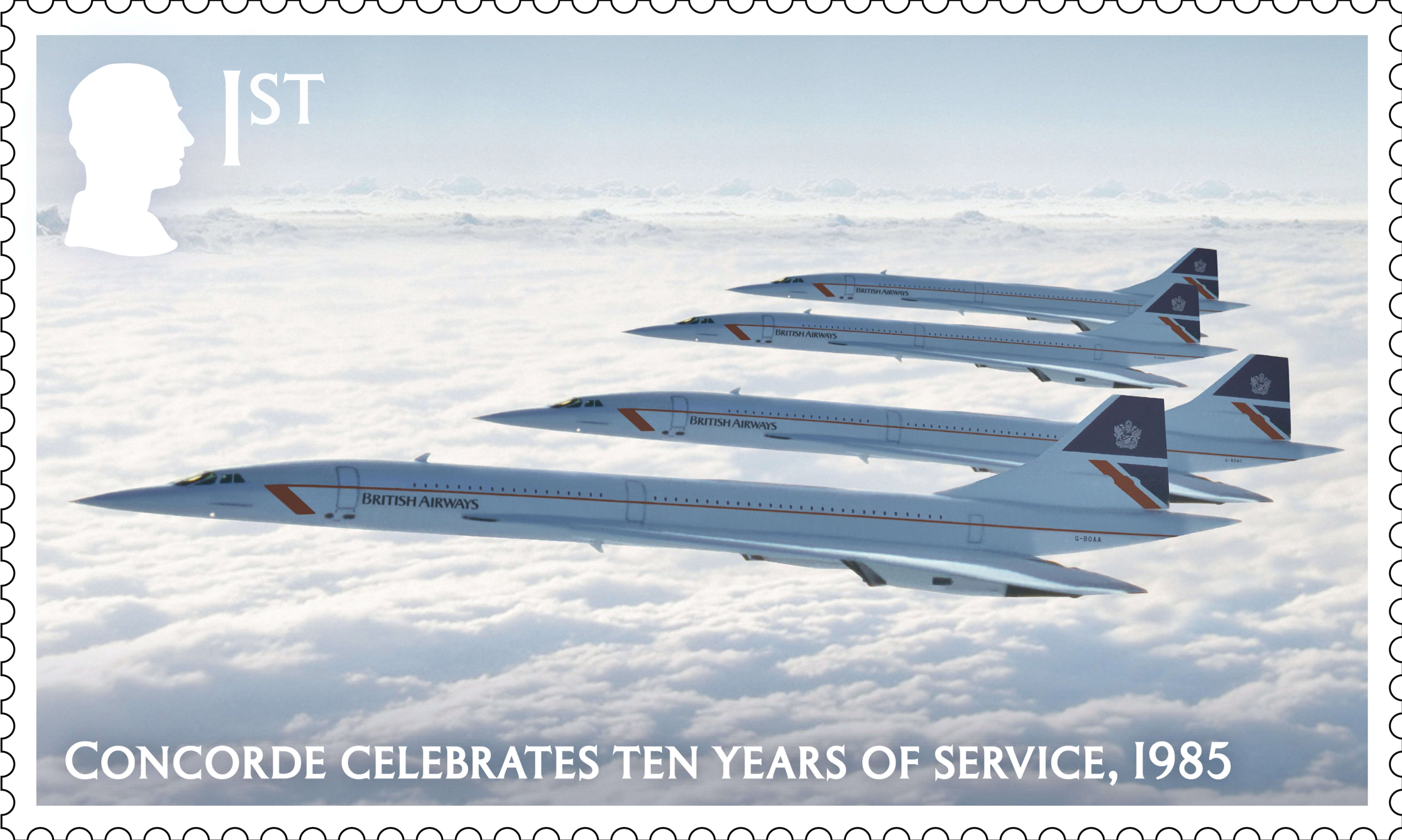 The main set of eight stamps features stunning photography of the British Airways aircraft throughout its history, including its first and last commercial flights. One of the stamps uses photography of four Concordes flying in formation to celebrate 10 years of service.